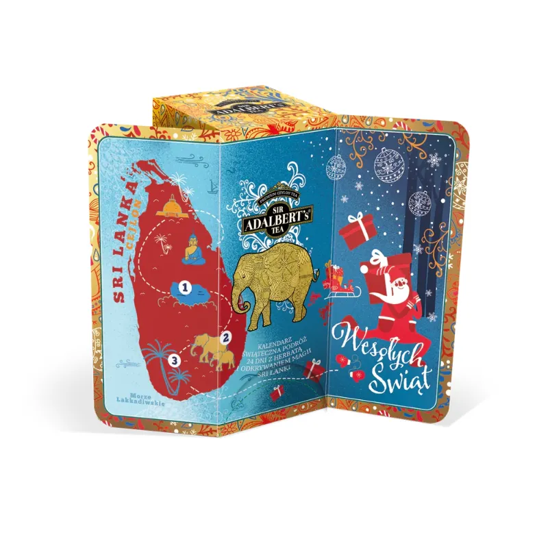 Adalbert’s Tea Świąteczna Podróż to ekskluzywny kalendarz adwentowy z 24 saszetkami cejlońskich herbat o egzotycznych smakach Sri Lanki. Złote opakowanie, wyjątkowe aromaty i idealny prezent dla miłośników podróży i herbaty.
