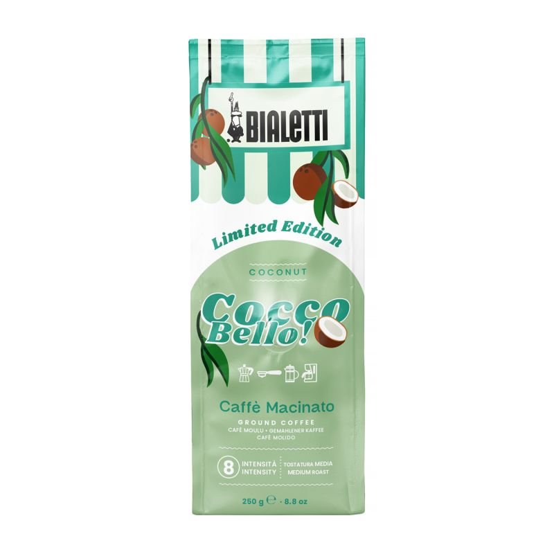 Bialetti Caffe Macinato Cocco Bello to niezwykła, włoska mieszanka kawy Arabiki (80%) oraz kawy Robusty (20%). Tę aromatyczną kawę wzbogacono aromatem, czemu zawdzięcza swój smak i aromat kokosa. Ziarna kawy zostały wypalone w tradycyjny sposób aż do uzyskania odpowiedniego profilu wypalenia. Doskonała do picia zarówno na ciepło, jak i na zimno.