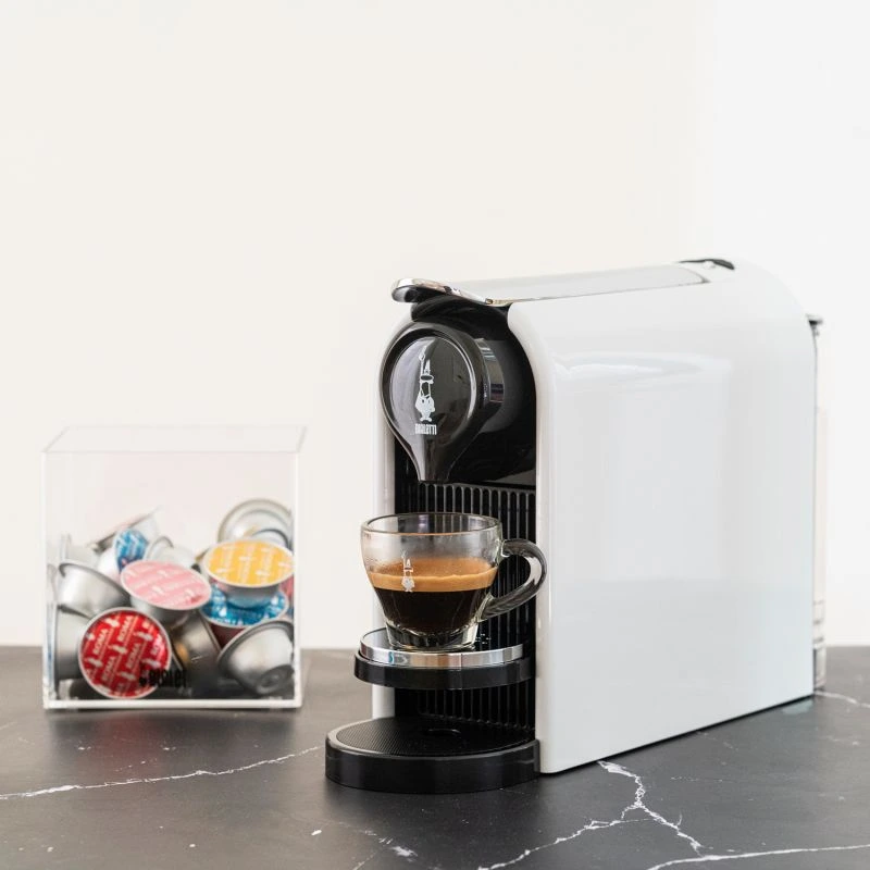 Regulator temperatury i długości kawy oraz kontrolki informujące o potrzebach urządzenia (braku wody, pełnym pojemniku na kapsułki czy konieczności odkamieniania) współpracują z nowym systemem ekstrakcji Bialetti 2.0, który zapewnia kremowe, aksamitne espresso jak z włoskiej kawiarni.