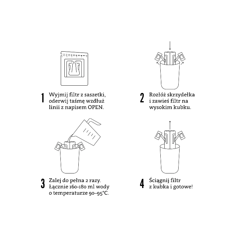 Każda saszetka zawiera jeden Drip Bag, a każdy Drip Bag ma w sobie 12g kawy. Po wyjęciu Drip Baga z saszetki oderwij jego górną część zgodnie z zaznaczeniem, rozłóż skrzydełka i umieść na kubku. Zalewaj wodą dwa razy. Są na to dwa sposoby:
