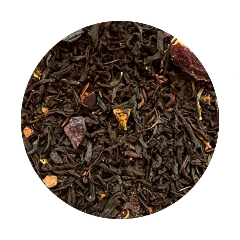 Pyszna czarna herbata wysokiej jakości z dodatkiem płatków róży, skórki pomarańczowej, mandarynka. Wyrazisty smak czarnej herbaty z dodatkiem nuty cytrusów.