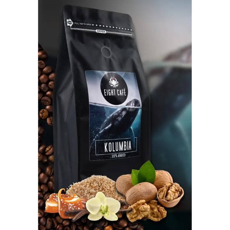 Kawa 100% Arabica pochodzącej z Kolumbii o intensywnym smaku oraz aromacie. Produkt marki Eight Café, idealny dla miłośników kawy wysokiej jakości.