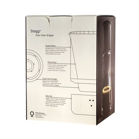 Fellow Stagg XF to stalowy dripper, za pomocą którego w prosty sposób zaparzysz kawę w domowych warunkach. Naczynie pozwala na jednorazowe zaparzenie około 600ml kawy. Jego pionowe ścianki i sitko z wieloma dziurkami sprawiają, że przepływ kawy jest dość szybki. Dodatkowa podstawka z miarką ułatwia odmierzenie odpowiedniej ilości ziaren nawet bez wagi; może też pełnić rolę ociekacza. Naczynie jest wykonane ze stali nierdzewnej, która dobrze utrzymuje temperaturę podczas parzenia. Sitko jest otoczone silikonową uszczelką. Zestaw zawiera 10 papierowych filtrów.