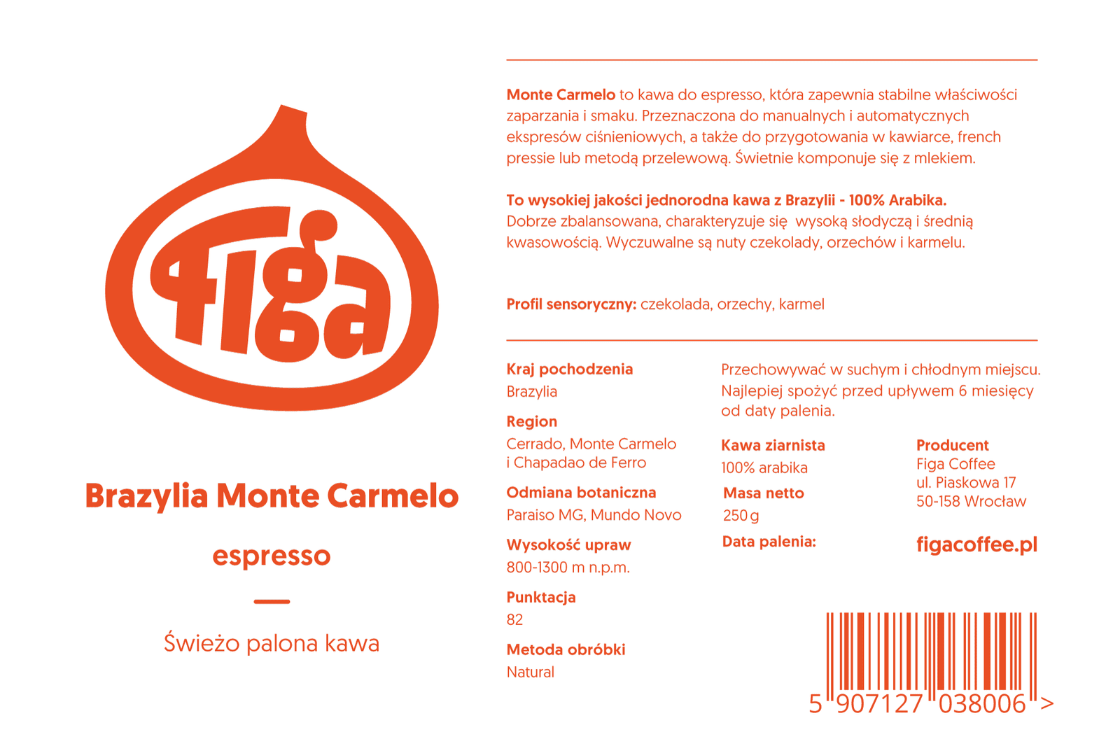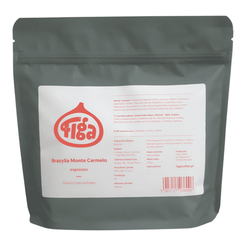 Kawa ziarnista jakości speciality pochodząca z Brazylii, wypalona we wrocławskiej palarni Figa Coffee. Średnio palona, idealna do ekspresu ciśnieniowego i kawiarki. W smaku wyczuwalne są nuty czekolady, orzechów oraz karmelu.