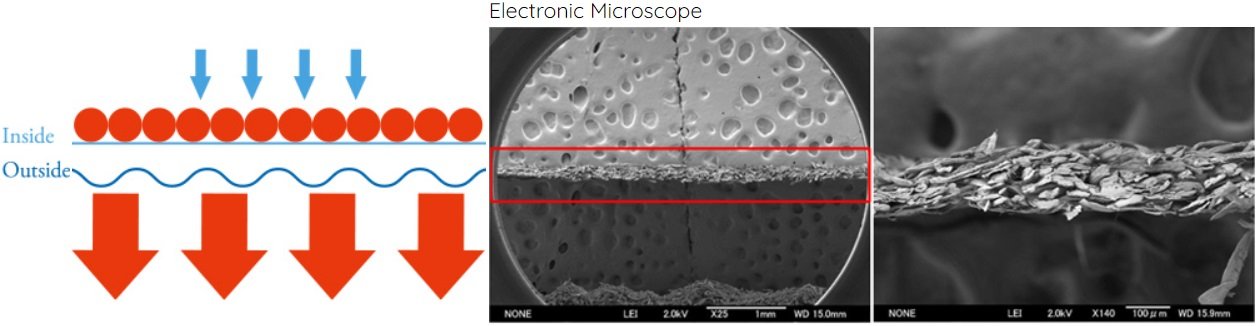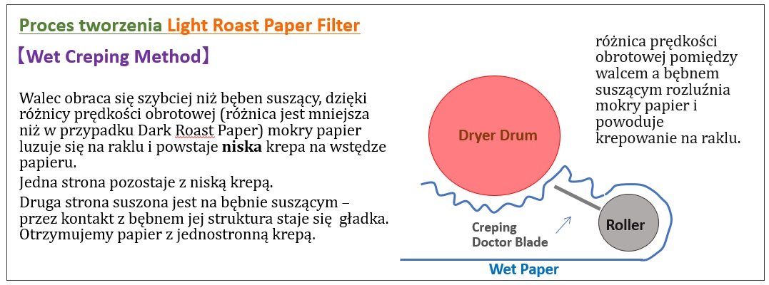 Nie ma krepy wewnątrz filtru więc wewnętrzna powierzchnia jest mała. Drobne drobinki kawy przyczepiają się do tego niewielkiego obszaru, dzięki czemu powstaje relatywnie niewiele ścieżek dla przejścia wody, która w pierwszej fazie gromadzi się wewnątrz filtru. Gromadząc wodę w środku, filtr wydobywa dużo aromatu z kawy. Dzięki zaś zewnętrznej krepie, napar kawowy przepływa przez filtr na zewnątrz bardzo płynnie i stabilnie. Ponieważ gęstość papieru jest wysoka, prawie wszystkie drobinki kawy pozostają w filtrze a tym samym możesz się cieszyć czystym naparem w filiżance.