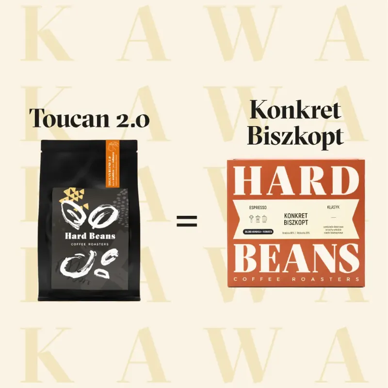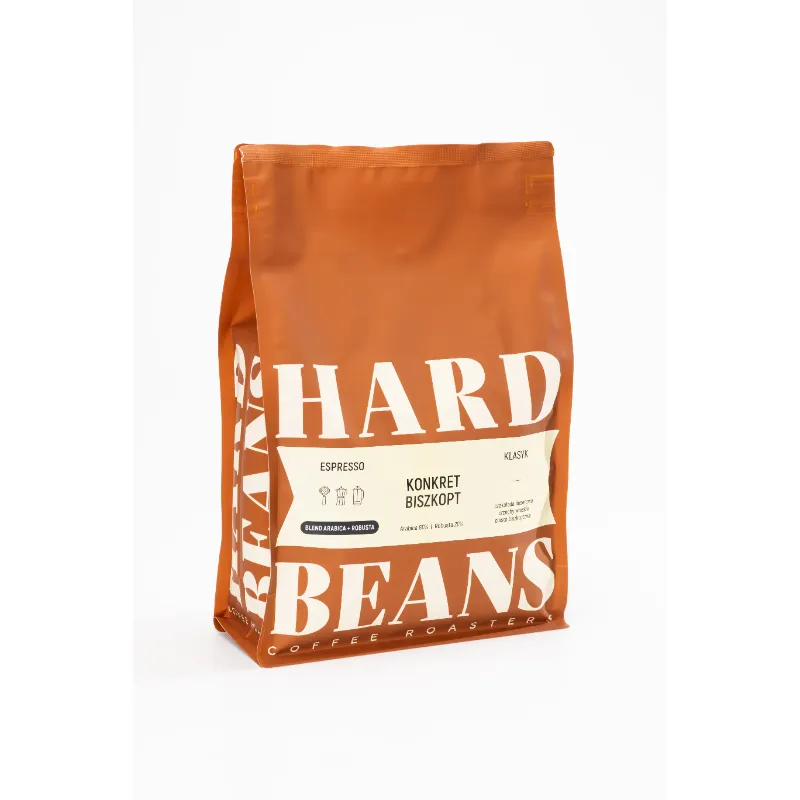 Hard Beans Konkret Biszkopt Espresso to ciemno palona kawa ziarnista typu specialty, stworzona z mieszanki Arabiki z Brazylii (Cerrado) oraz Robusty z Wietnamu, Indonezji i Ugandy. W smaku dominuje przyjemna czekoladowo-orzechowa słodycz z nutą ciasta biszkoptowego. Doskonała do ekspresu ciśnieniowego i kawiarki – tworzy gęsty, aromatyczny napar z obfitą cremą. Idealna dla miłośników klasycznego espresso o pełnym body i intensywnym charakterze.