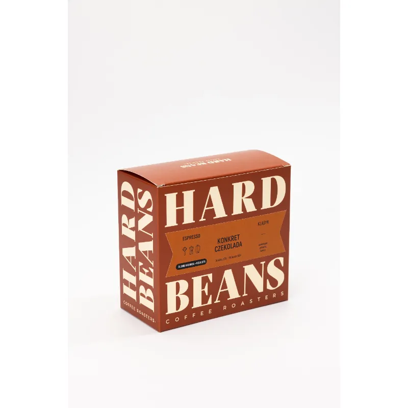 Hard Beans Konkret Czekolada Espresso to zbalansowana mieszanka 50% Arabiki z Brazylii i 50% Robusty z Azji (Wietnam, Indonezja, Uganda), palona w średnim stopniu pod espresso. Kawa o niskiej kwasowości, intensywnej goryczce i wyraźnych nutach czekolady, orzechów oraz kakao. Tworzy pełny, aromatyczny napar o deserowym charakterze, który doskonale komponuje się z mlekiem. Idealna propozycja dla miłośników klasycznego, wyrazistego espresso.
