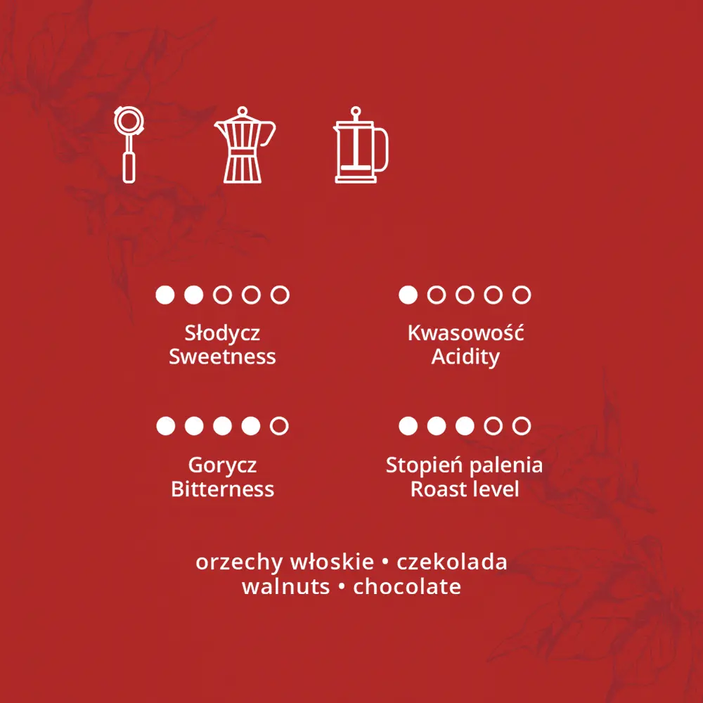 Połączenie niebanalnej słodyczy czekolady i orzechów włoskich oraz nadzwyczajnej cielistości, dopełnione subtelnym muśnięciem kwasowości to cechy, które wyróżniają ją na tle kawowej przeciętności. Znakomity wybór dla kawowych tradycjonalistów.