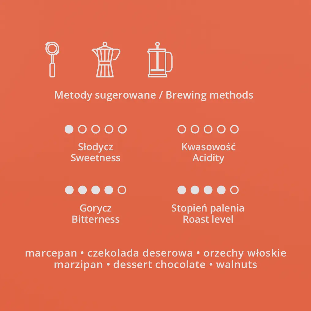 Kawę najlepiej przygotować w ekspresie ciśnieniowym lub automatycznym. Świetnie pasuje również do kawiarki i french pressa.