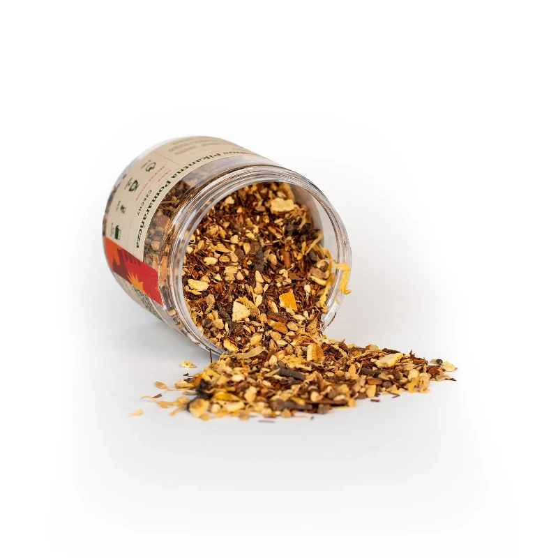 Skład: imbir, rooibos, kardamon, cynamon, skórka pomarańczy, goździki, naturalny aromat, płatki nagietka. Może zawierać śladowe ilości orzechów.