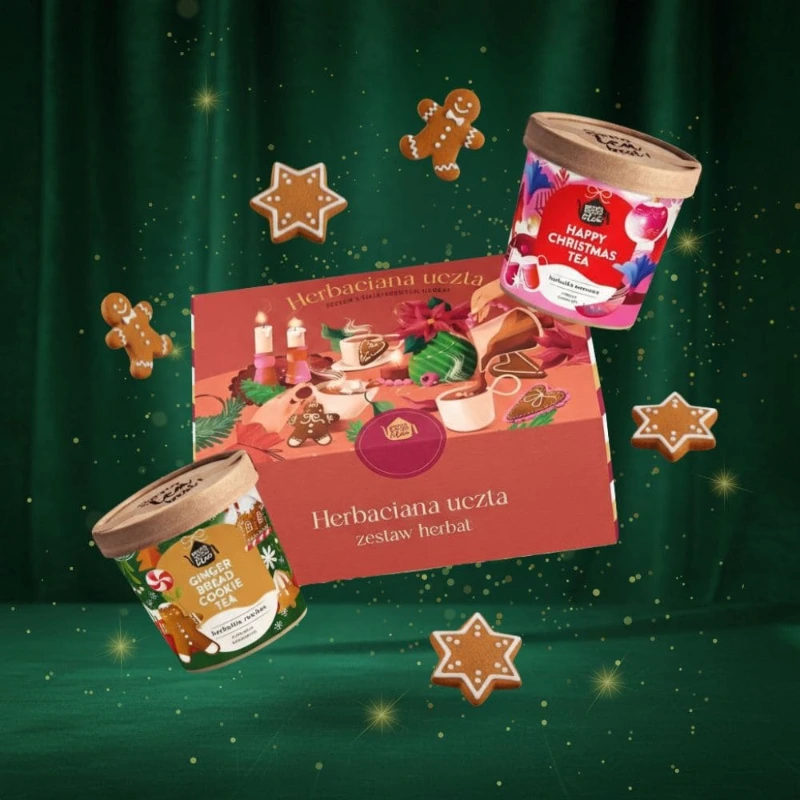 Limitowana edycja zestawu świątecznego dwóch herbatek sypanych. GINGERBREAD COOKIE TEA, czyli bestsellerowy rooibos o smaku piernika oraz HAPPY CHRISTMAS – napar owocowy na bazie hibiskusa. Zestaw dwóch mieszanek po 50 g