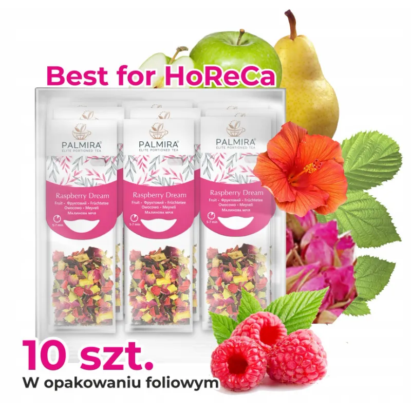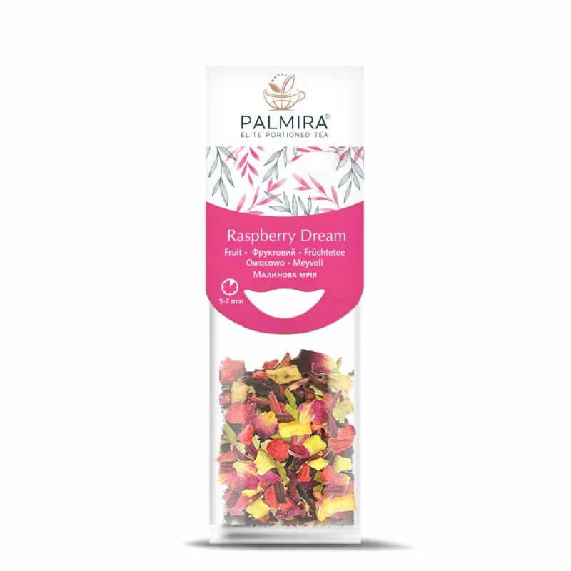 Herbata owocowa Palmira Raspberry Dream to aromatyczna mieszanka malin i gruszek z dodatkiem hibiskusa, liści jeżyny i mate. Delikatnie słodka i owocowa, pobudza zmysły i przywołuje smak lata. Idealna na relaks o każdej porze dnia.