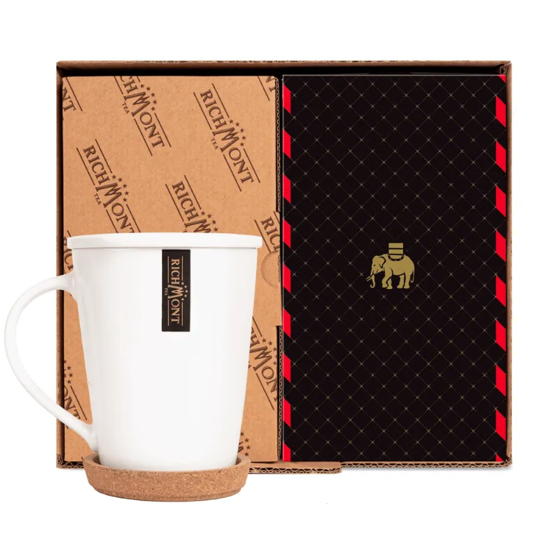 Do zestawu dołączony jest porcelanowy kubek Richmont o pojemności 450 ml z dopasowanym wieczkiem oraz korkową podstawką. Zestaw pozwala dłużej utrzymać odpowiednią temperaturę naparu i wprowadza odrobinę luksusu do codziennego rytuału picia herbaty.