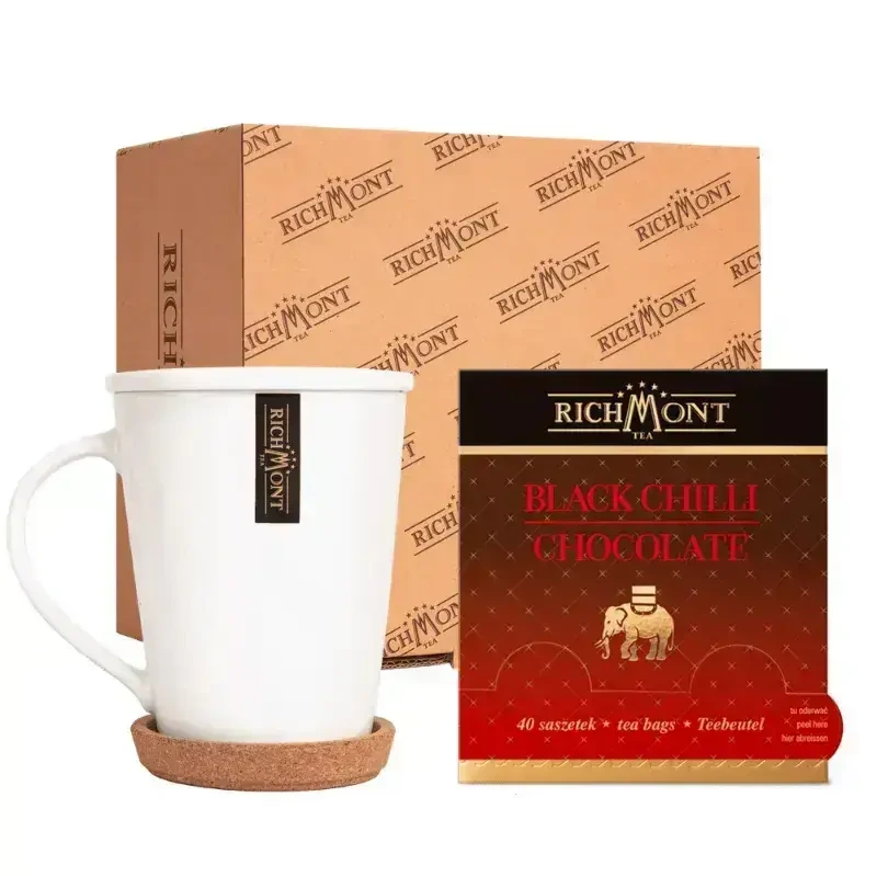 Richmont Black Chilli Chocolate to wyjątkowa czarna herbata, w której słodycz czekolady spotyka się z pikantną nutą chilli. Jej aromat jest zmysłowy, głęboki i rozgrzewający. W zestawie znajdziesz 40 saszetek oraz elegancki porcelanowy kubek z wieczkiem i korkową podstawką – doskonały prezent dla miłośników intensywnych, nietuzinkowych smaków.
