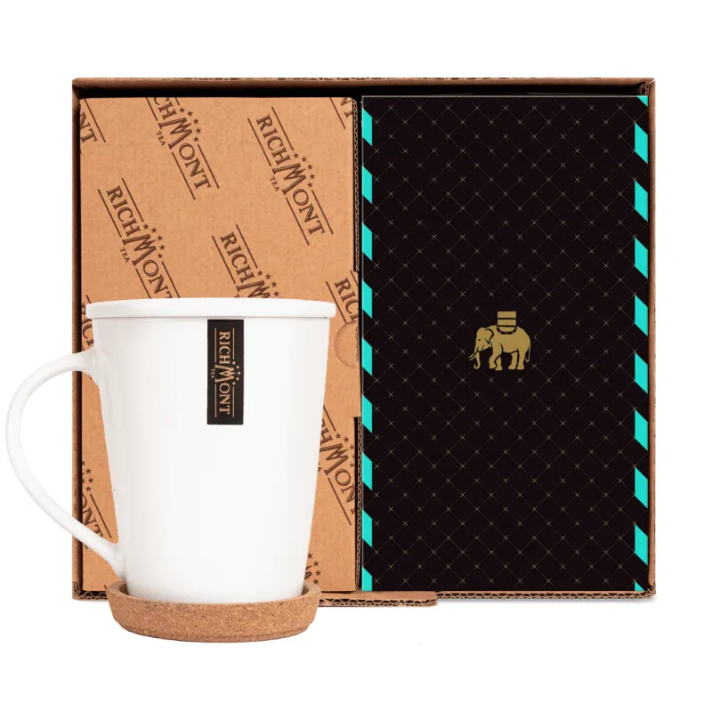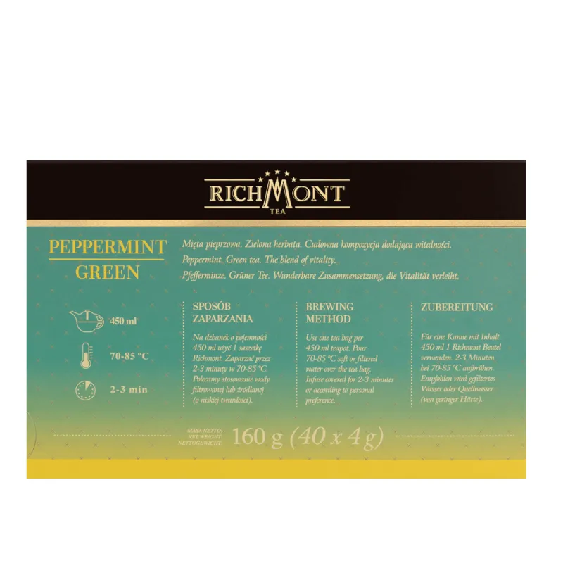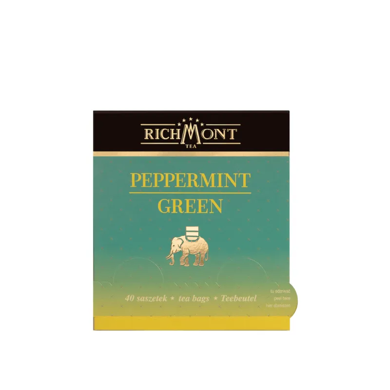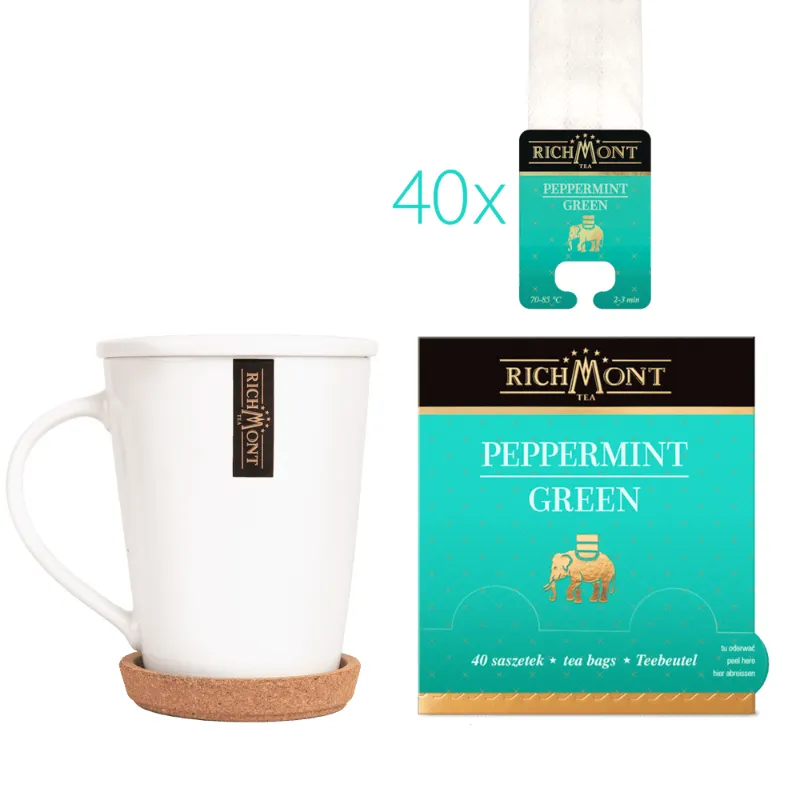 Richmont Peppermint Green to orzeźwiająca kompozycja delikatnej zielonej herbaty i aromatycznej mięty pieprzowej. Napar ma świeży, lekki smak i subtelny zapach, który dodaje energii o każdej porze dnia. W zestawie znajdziesz 40 saszetek oraz porcelanowy kubek z wieczkiem i korkową podstawką – idealny prezent dla miłośników harmonii i naturalnej świeżości.