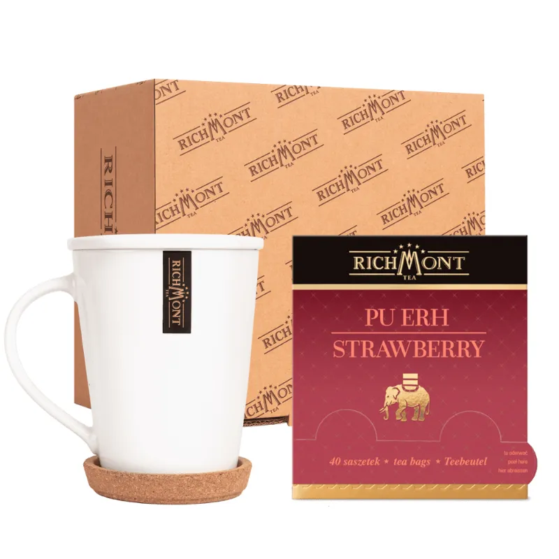 Richmont Pu-Erh Strawberry to harmonijne połączenie klasycznej herbaty Pu-Erh z naturalną nutą truskawki. Napar ma głęboki, mahoniowy kolor i zrównoważony, lekko owocowy smak. W zestawie 40 saszetek oraz porcelanowy kubek z wieczkiem i korkową podstawką – idealny prezent dla osób ceniących wyraziste, aromatyczne herbaty premium.