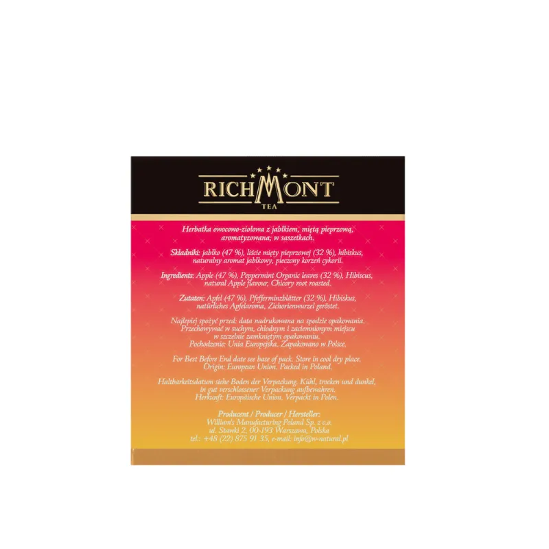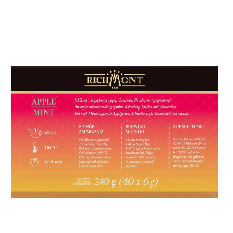 Richmont Apple Mint to orzeźwiająca herbatka owocowo-ziołowa, łącząca słodycz jabłka z chłodnym akcentem mięty pieprzowej. Delikatny, jasny napar relaksuje i dodaje energii. W zestawie 40 saszetek oraz porcelanowy kubek z wieczkiem i korkową podstawką – doskonały pomysł na prezent lub codzienny rytuał odprężenia.