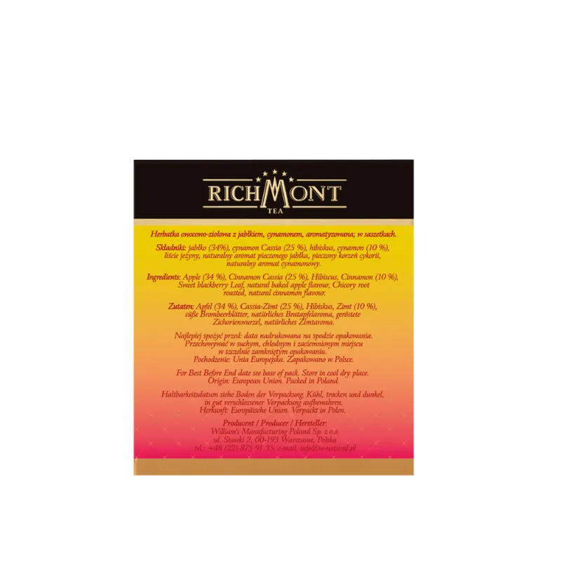 Właścicielem tej wyjątkowej marki premium jest polski producent Sir William’s. RICHMONT to wieloletnia tradycja połączona z nowoczesnością i dążeniem do uzyskania najwyższej jakości wyrobów. Za ogromnym sukcesem firmy stoi staranna selekcja liści herbaty pochodzących z najdalszych zakątków świata. W ten sposób udało się stworzyć wyjątkowe kompozycje smakowe, które zadowolą każdego miłośnika herbacianego naparu. W asortymencie dostępne są herbaty: