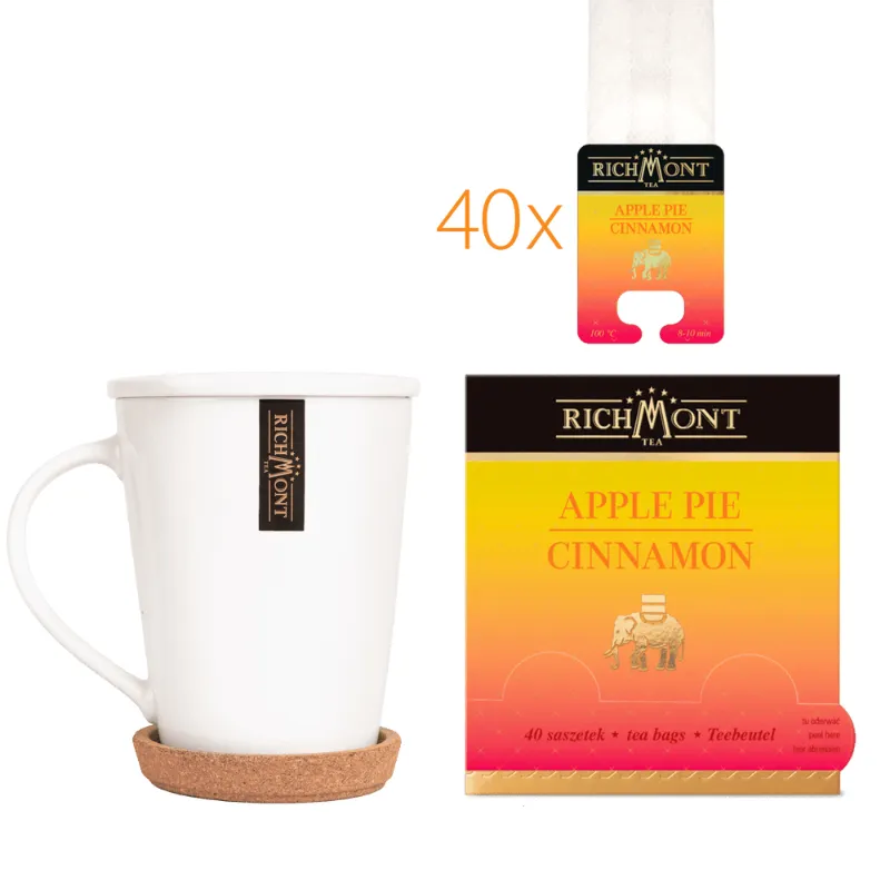 Richmont Apple Pie Cinnamon to aromatyczna herbatka owocowo-korzenna o smaku pieczonego jabłka i cynamonu. Jej słodko-przyprawowy napar przywołuje ciepło domowego ciasta i tworzy atmosferę relaksu. W zestawie 40 saszetek oraz porcelanowy kubek z wieczkiem i korkową podstawką – idealny prezent na chłodniejsze dni.