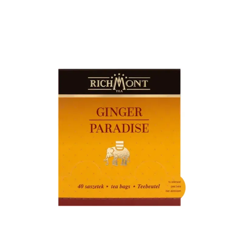 Richmont Ginger Paradise to rozgrzewająca herbatka z imbirem, cynamonem i kardamonem, wzbogacona owocową nutą ananasa. Napar ma intensywny aromat i głęboki smak, który pobudza i poprawia nastrój. W zestawie 40 saszetek oraz porcelanowy kubek z wieczkiem i korkową podstawką – doskonały prezent dla miłośników wyrazistych herbat.