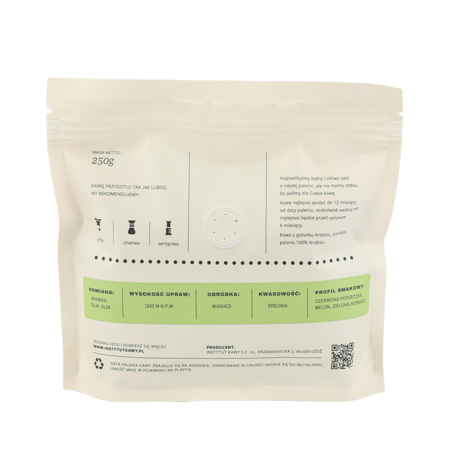 Kawa ziarnista jakości specialty pochodząca z Kenii, wypalona przez Instytut Kawy. Palona jasno, idealna do ekspresu przelewowego, dripa, Chemexa, AeroPressa, French Pressa, oraz innych alternatywnych metod parzenia. W jej smaku pojawiają się nuty zbliżone do czerwonej porzeczki, melona i zielonej herbaty.