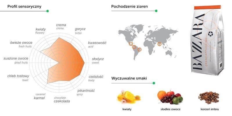 Bazzara GranCappuccino to wysokiej jakości kawa, która jest przeznaczona do parzenia w ekspresach kolbowych oraz automatycznych. Jeżeli odpowiednio zmielimy jej ziarna, to przygotujemy ją również w kawiarce lub French Pressie.