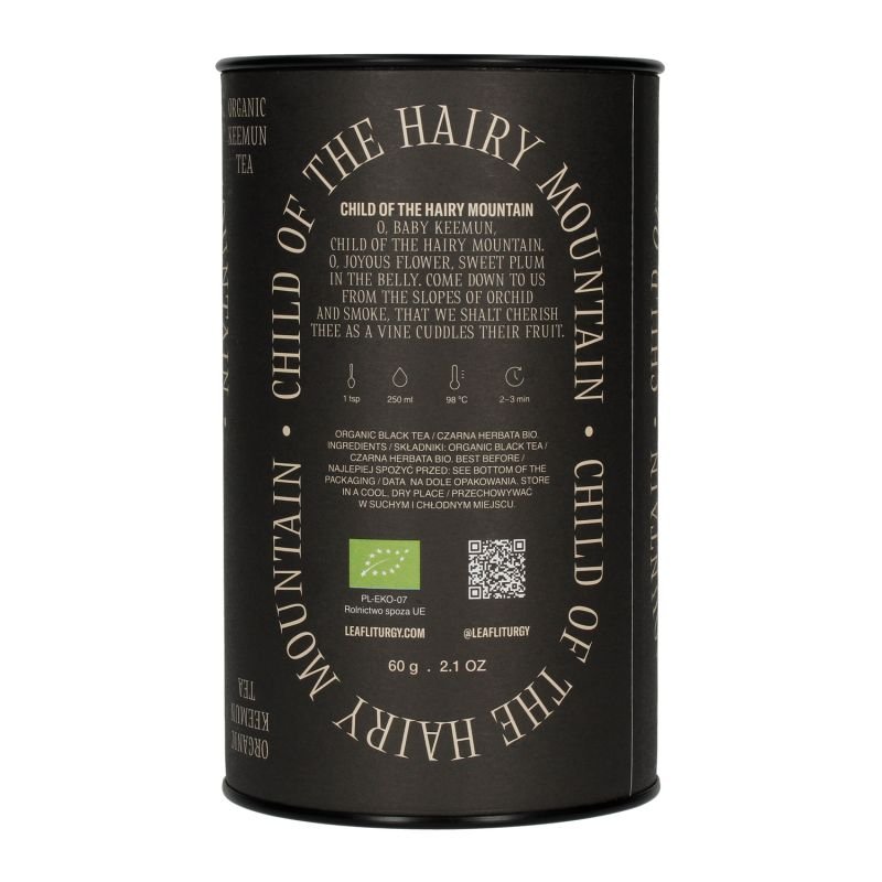 Leaf Liturgy Child of the Hairy Mountain to czarna herbata sypana typu Keemun. Po raz pierwszy została przygotowana w Chinach w 1875 r. odmiana znana też jako czerwona herbata, szybko stała się ulubioną herbatą Anglików, a wkrótce rozpowszechniła się także na rynku indyjskim. Hairy (włochaty) Mountain (góra) odnosi się do wyglądu liści. Przed obróbką mają one delikatny puch, a po jej zakończeniu przypominają szczyt góry.