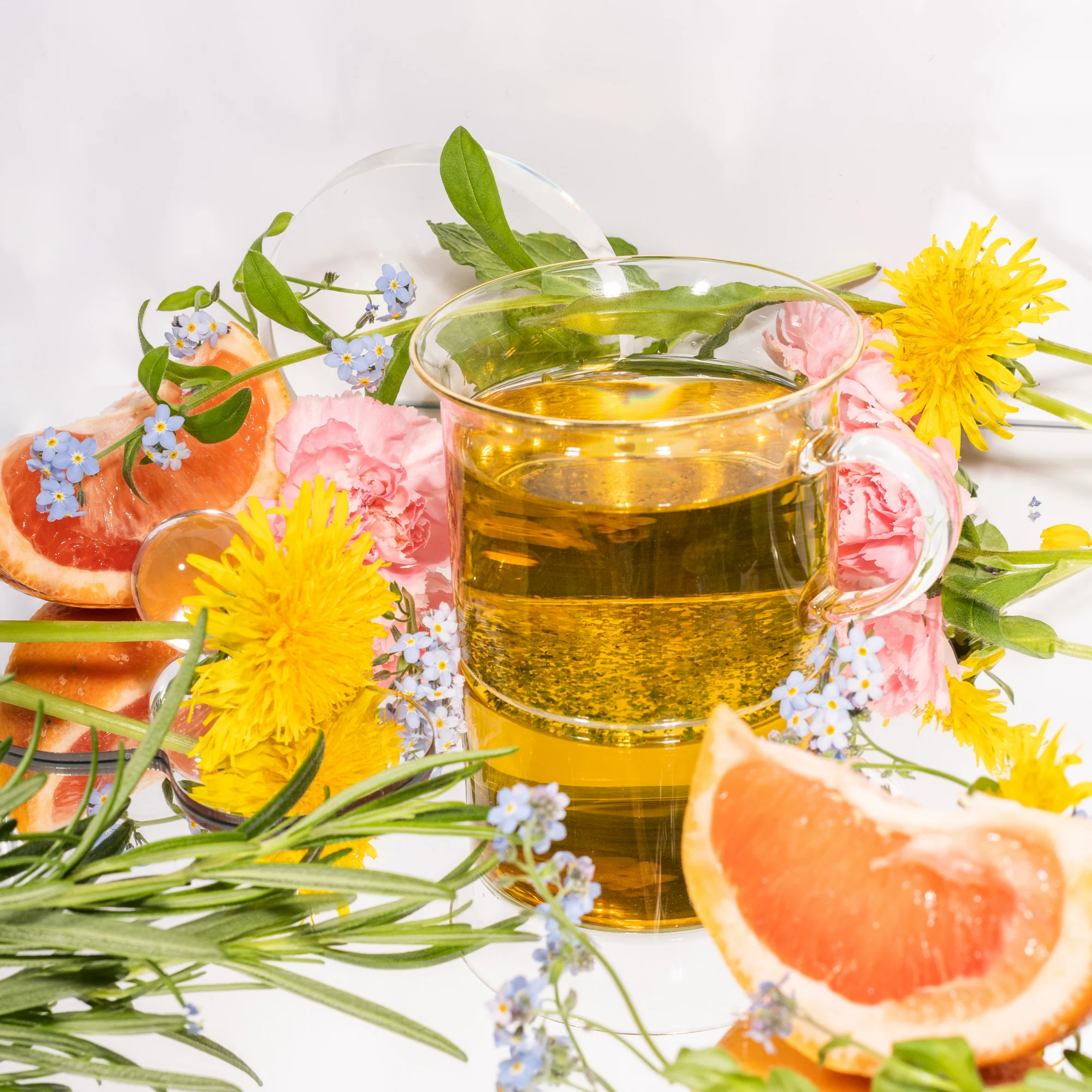 Skrzyp, mniszek lekarski zioło, mniszek lekarski korzeń, mięta pieprzowa, moringa, rozmaryn, grejpfrut liofilizowany, trawa cytrynowa, tulsi, koper włoski, olejek grejpfrutowy, olejek rozmarynowy, olejek pomarańczowy. Osoby zażywające leki lub chore, kobiety w ciąży powinny skonsultować się z lekarzem przed zastosowaniem produktu. Może zawierać znikome ilości: glutenu (mniej niż 20 mg/1kg), orzechów, soi, gorczycy, selera.