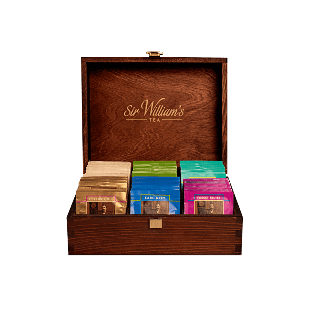 Skrzynka z naturalnego drewna do prezentacji herbat Sir William’s to gustowny i jednocześnie praktyczny prezent do domu lub biura. Pozwala na estetyczną prezentację herbat i ich efektowne serwowanie gościom lub klientom. W kolekcji jest sześć różnych smaków herbat po 15 saszetek umieszczonych w wygodnych przegródkach. Drewniany prezenter zawiera 90 saszetek herbat w 6 smakach (6×15 saszetek): Ceylon Gold, Earl Grey, Green Sencha, Peppermint, Williams White oraz Forest Fruits.