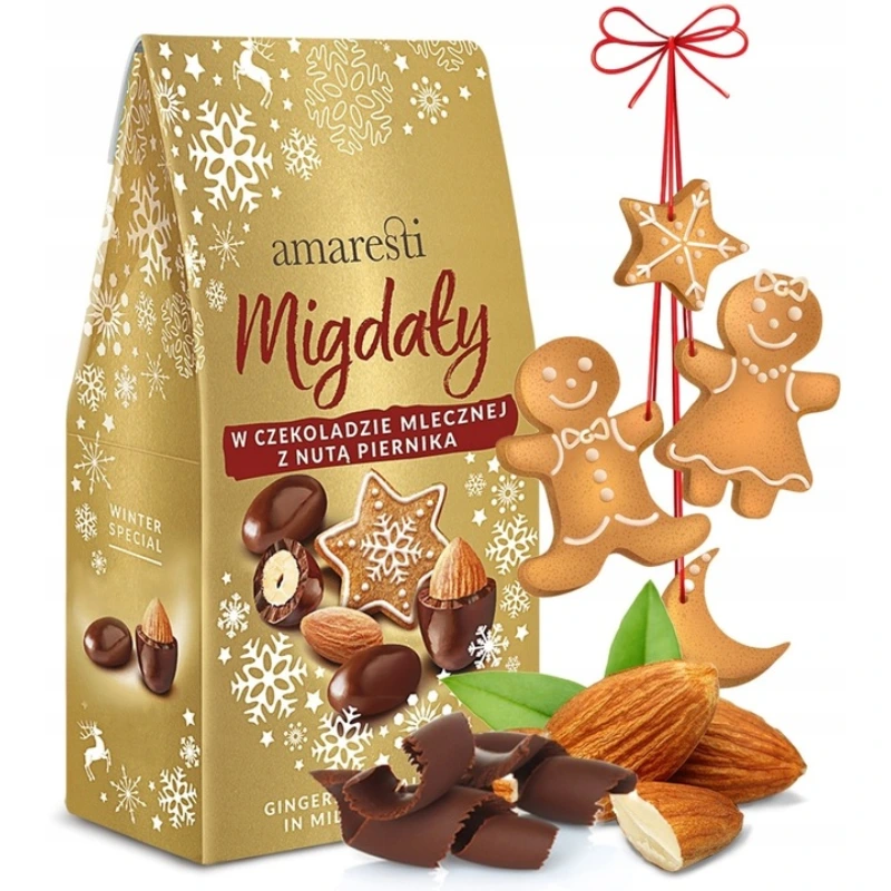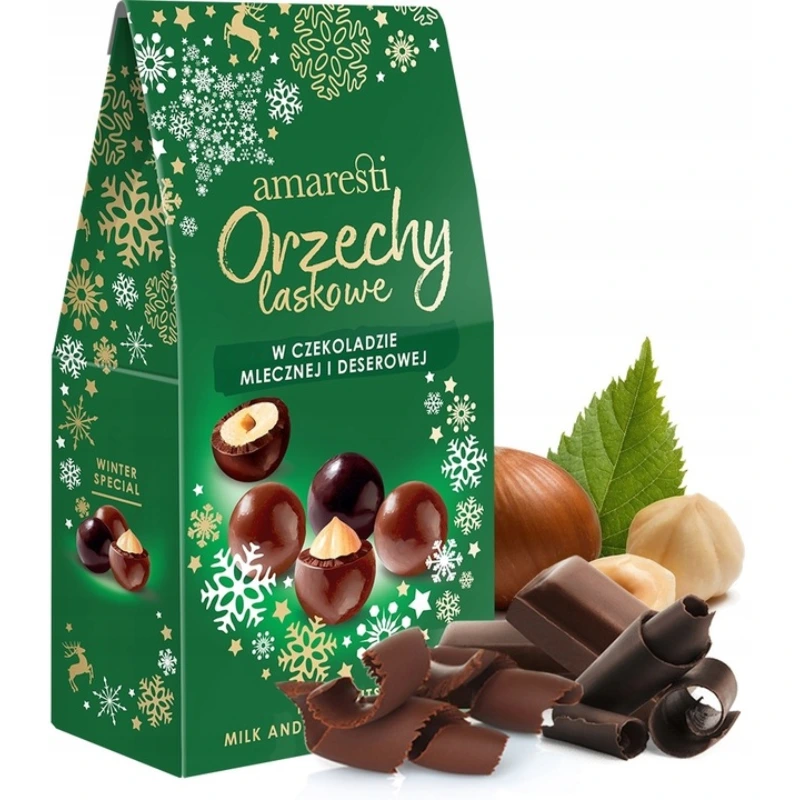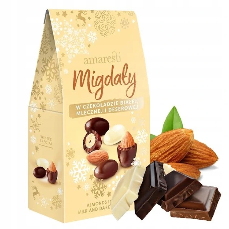 Linia Amaresti to najwyższej jakości prażone migdały oblane dwoma rodzajami czekolady: mleczną oraz białą z dodatkiem zmielonych ziaren kawy. Ta unikatowa kompozycja to gwarancja głębi słodkiego smaku i aromatu.