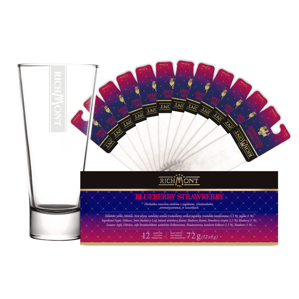| Zawartość opakowania | 12 saszetek Blueberry Strawberry + Szklanka Richmont Ice |